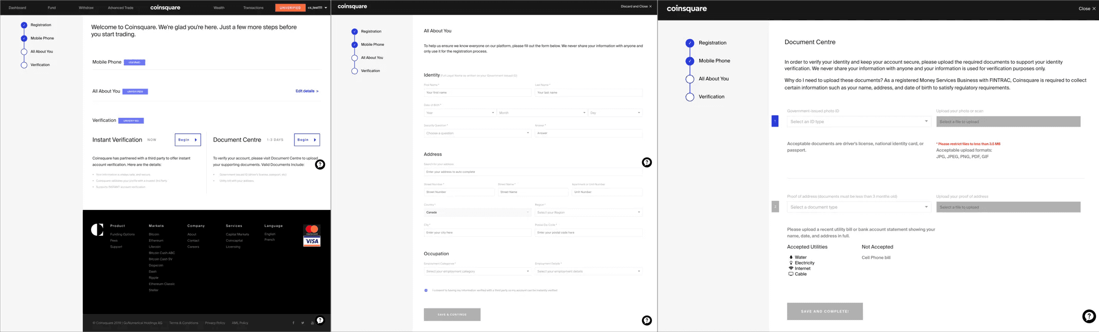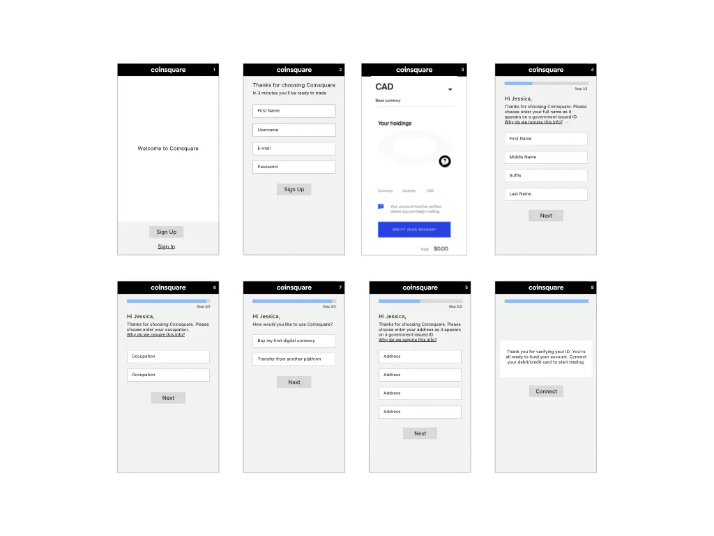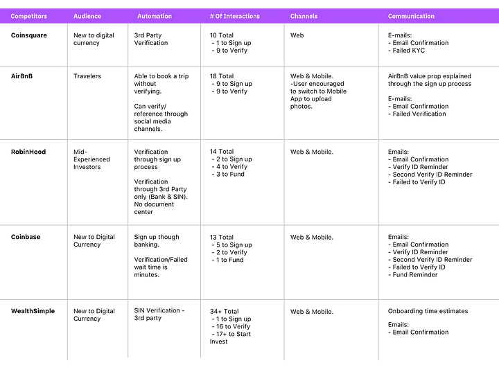 The cryptocurrency boom in 2017 brought on a lot of new users to the platform. During this time the competitive landscape in Canada offered about 3 different platforms and users had to deal with long wait-times to become verified. In 2018 Coinsquare offered quick verification times (compared to other platforms) and competitors had similar on boarding experiences. As the market slowed down, Coinsquare and competitors saw a need to re-visit on boarding, as people grew more selective of the platforms they chose and the information that was required to provide.