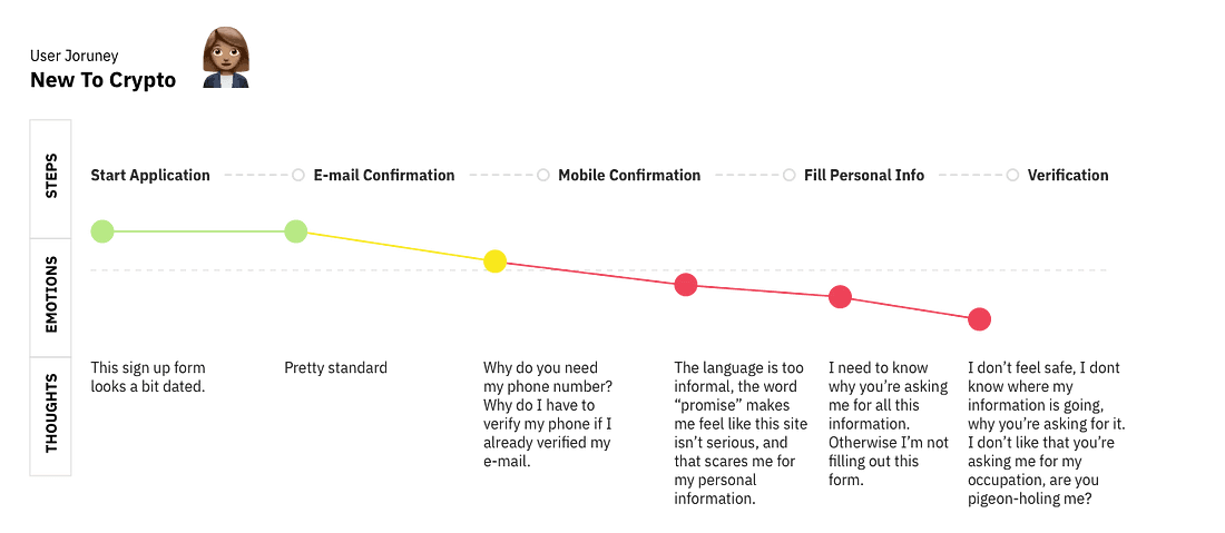 To understand the experience of these two users better we created a user journey map to see where in the process they felt the most uneasy. We wanted to attract new users to our platform, people that had heard of crypto currency and were interested in trying it out. We recoded a typical new user journey in order to understand their mindset.